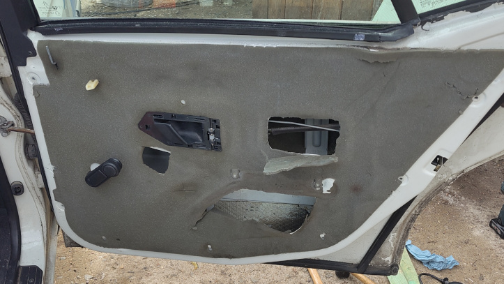Der Citröen wurde zur Werkstatt gefahren und innerhalb kürzester Zeit war die Innentürverkleidung abmontiert. Irgendwie ist es sogar gelungen, keinen der vielen Plastikclips abzubrechen. Auch der widerspenstige Metallclip, mit dem der Fensterheber festgehalten wird, wurde erfolgreich mit einem Flachkopfschraubendreher überlistet. Hinter der Verkleidung erwartete uns, so waren wir uns schnell einige, die Dampfbremse. Eine Plastikfolie, die Feuchtigkeit der Witterung dort lässt, wo sie hin gehört: Außerhalb der Fahrkabine. Es blieb uns trotzdem nichts anderes übrig, als die Folie zu opfern. An den Stellen, wo von Innen die Dellen im Außenblech zu sehen waren, wurde die Dampfbremse eingeschnitten, um mit Werkzeugen ans Außenblech heranzukommen.