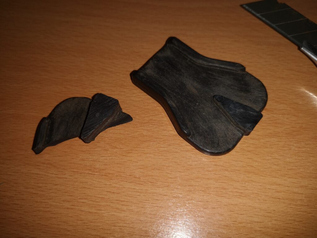 Somit wurden die Bruchstücke des Reißverschluss-Wagens sauber vermessen, etwas aufbereitet und ein Bild davon gemacht. Das Bild mit Inkscape in drei Vektoren geklickt und als SVG exportiert. Es wurde nur eine Hälfte der Hälfte abgezeichnet.