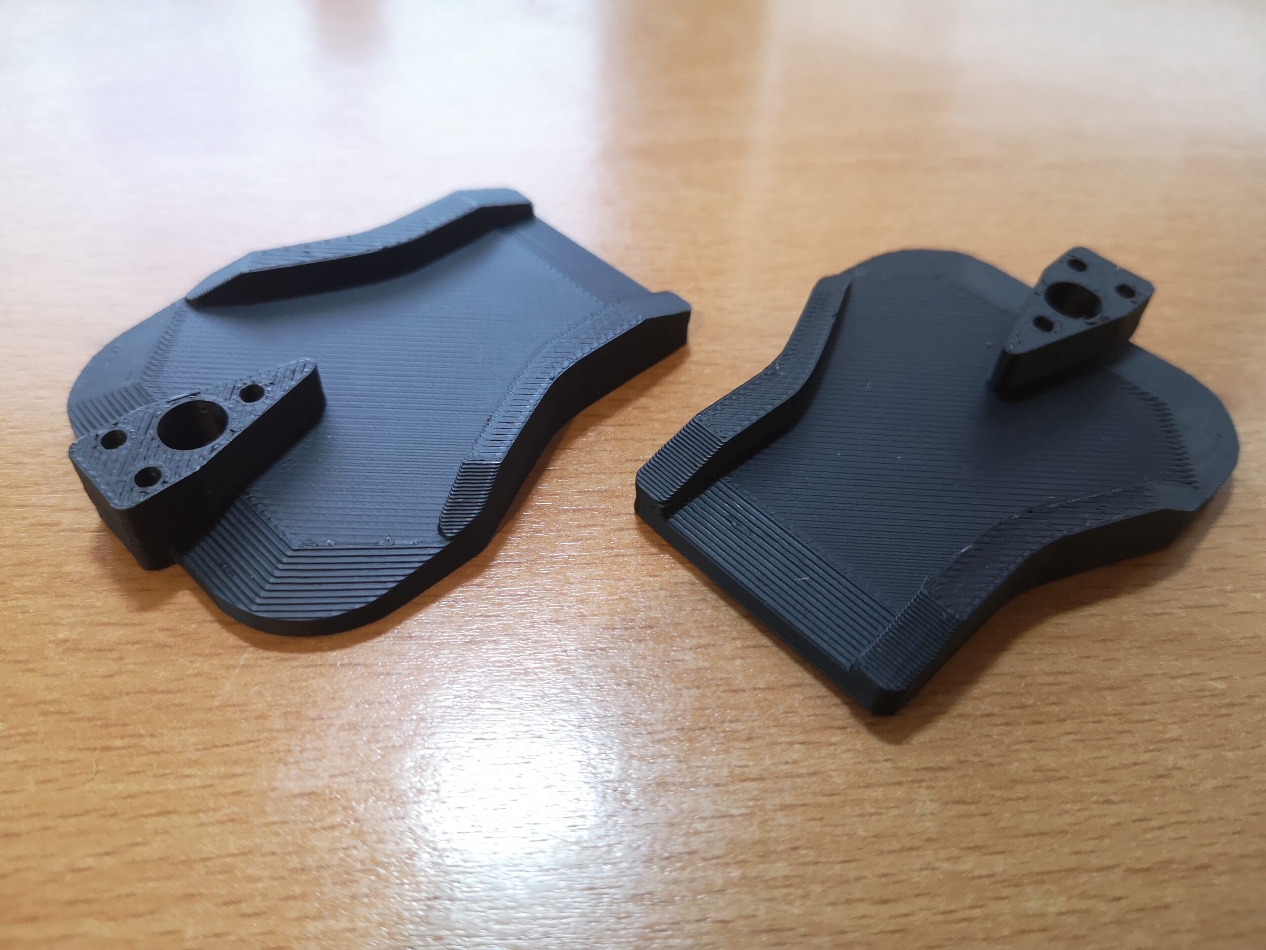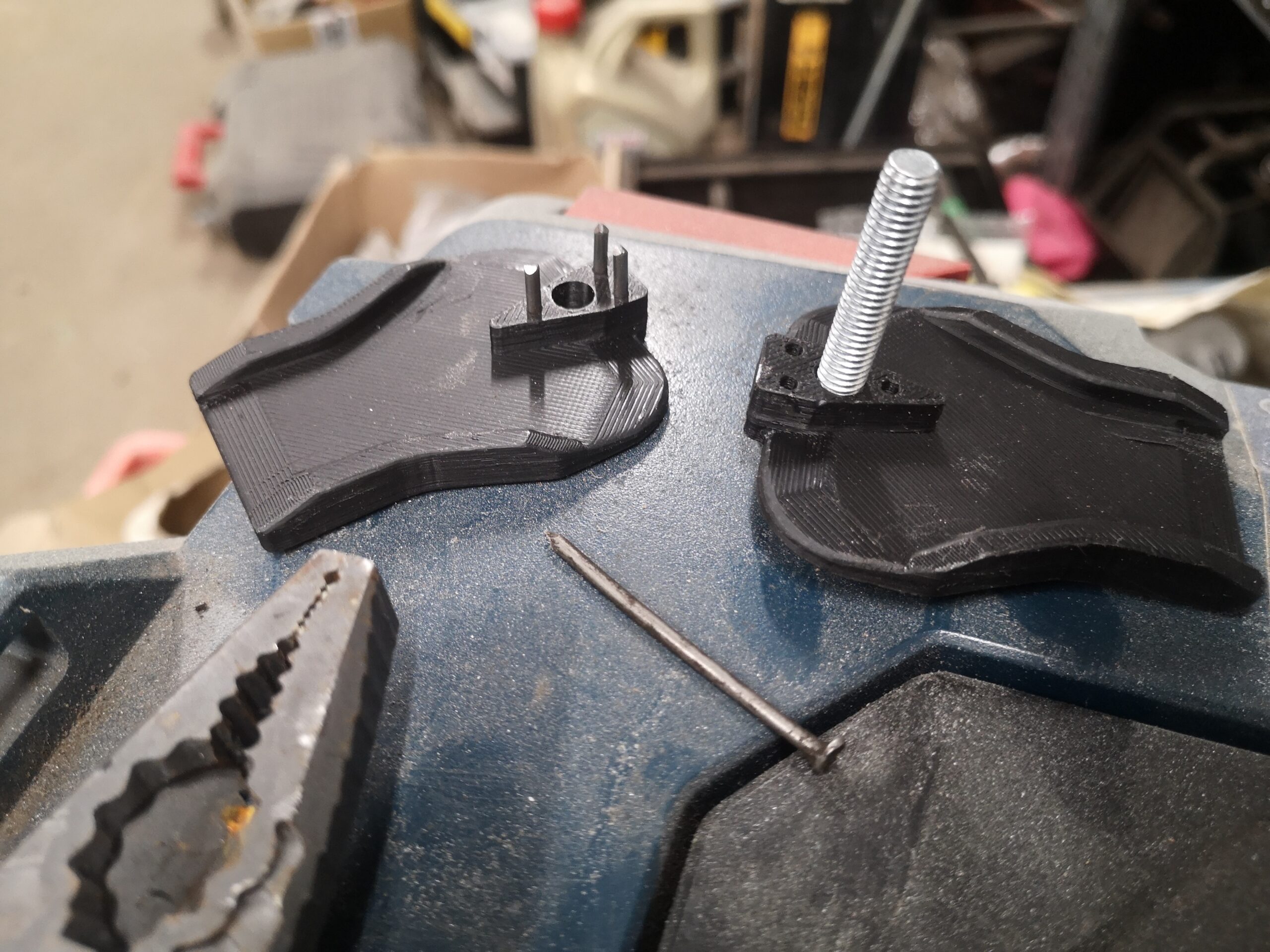 Nun hatten wir aber große Bedenken, dass der FFF (Fused Filament Fabrication)-Druck ausreichend stabil wird, gerade an der sehr geringen Verbindungsfläche zwischen den beiden „Schalen-Hälften“. Also wurde das Modell um ein großes Loch in der Mitte erweitert, wo später eine M6-Stahlschraube hindurch kam, welche die beiden Hälften zusammen halten sollte und auch als Griff fungierte. Damit sich die beiden Hälften nicht verdrehen können, wurden noch drei kleinere Löcher hinzugefügt, in welche kleine Stahlstifte hineinkamen, welche aus einem Stahlnagel zugeschnitten wurden.