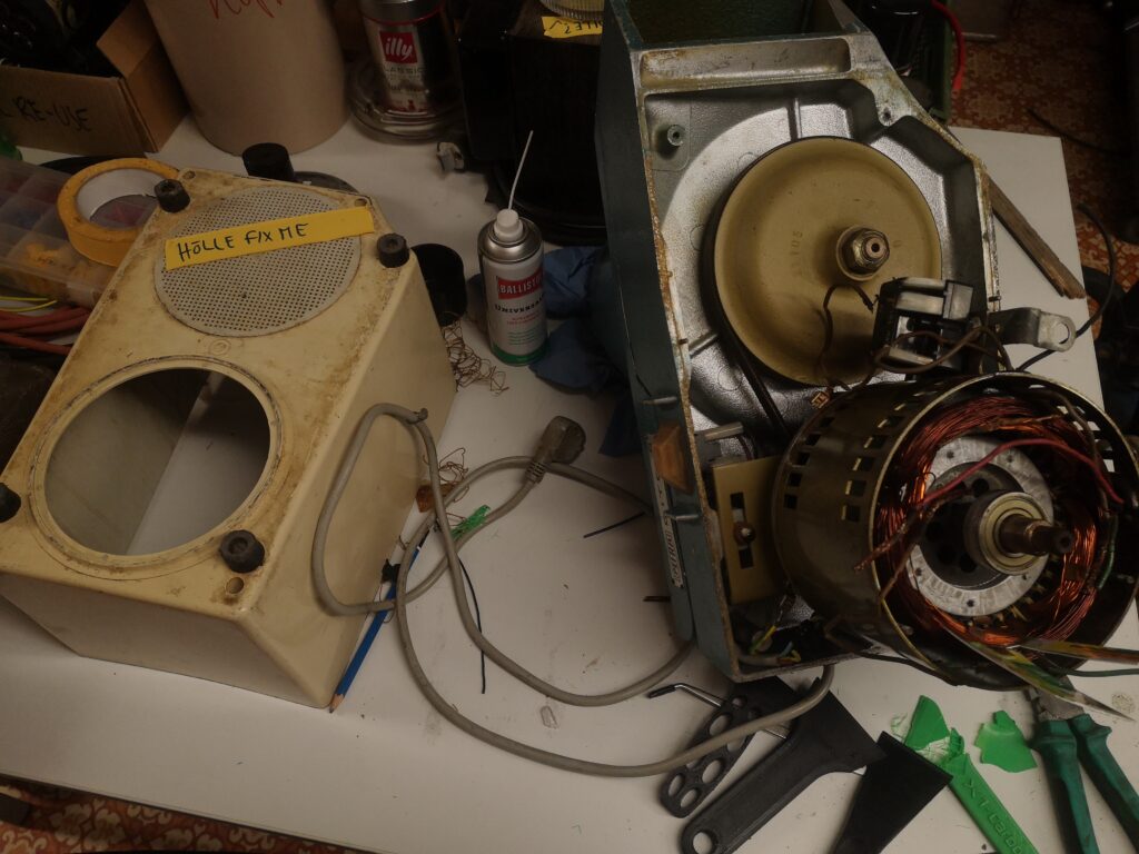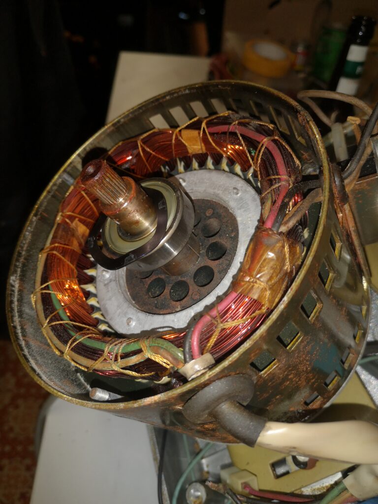 Leider waren die Aderisolierungen innerhalb des Motors auch spröde und abgefallen. Für eine Reparatur musste also der Motor auseinandergebaut werden, die Lackdrahtwicklungen auseinandergebogen, um frische Leitungen im tiefsten Inneren des Motors anlöten zu können.